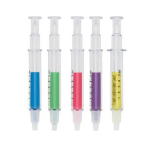 Descrição Completa: Caneta seringa marca texto MTB 006 plástica esferográfica. Possui medidor imitando uma seringa e tampa protetora nas duas pontas.